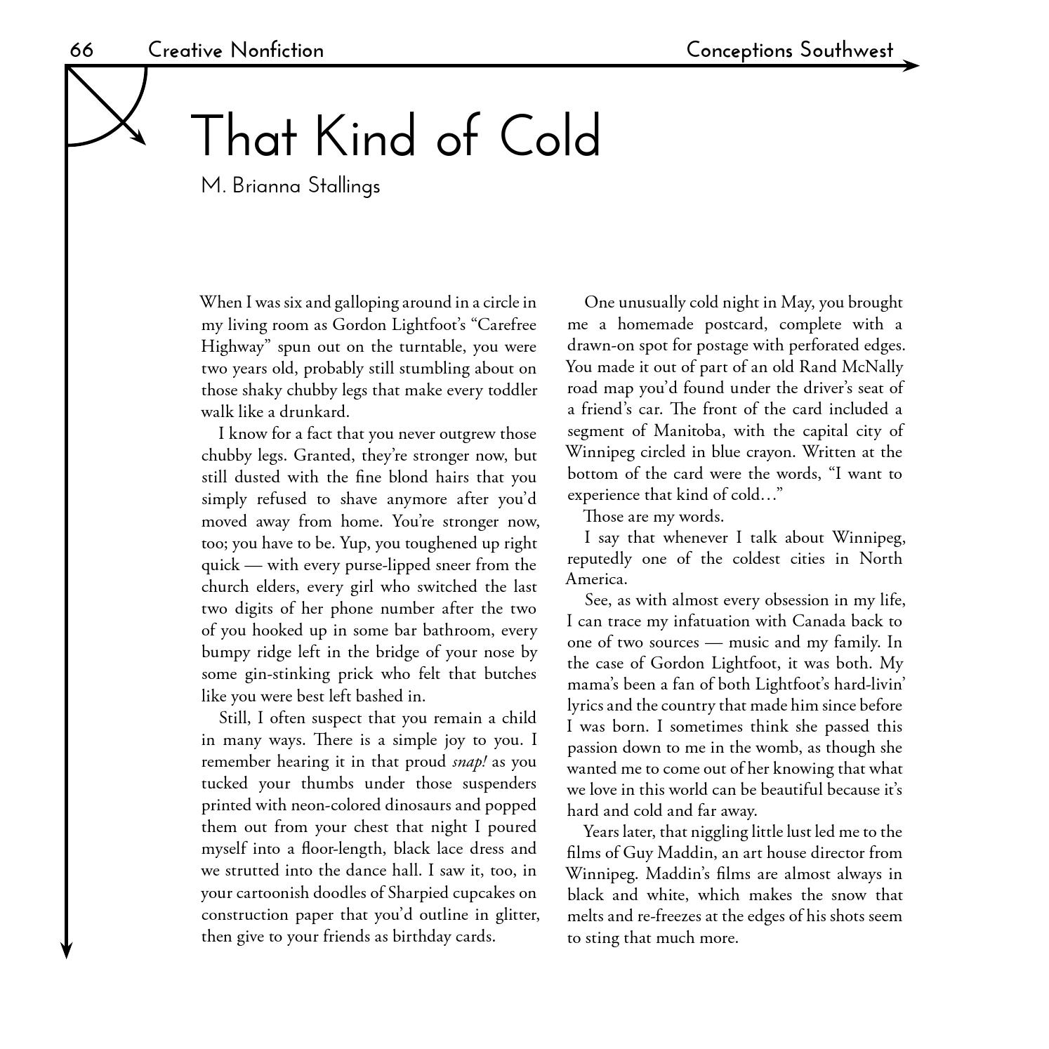Short creative nonfiction; story continues on page 67.